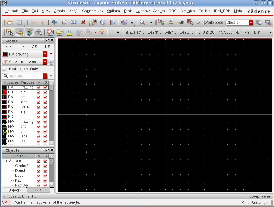In the layout design window (Virtuoso Layout Editing) click left mouse button for the first corner of the rectangle, then click left mouse button again for the second corner. A rectangle is drawn.