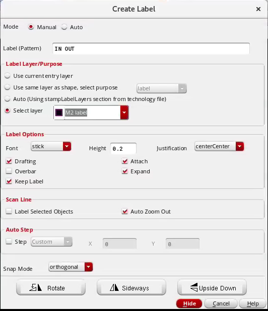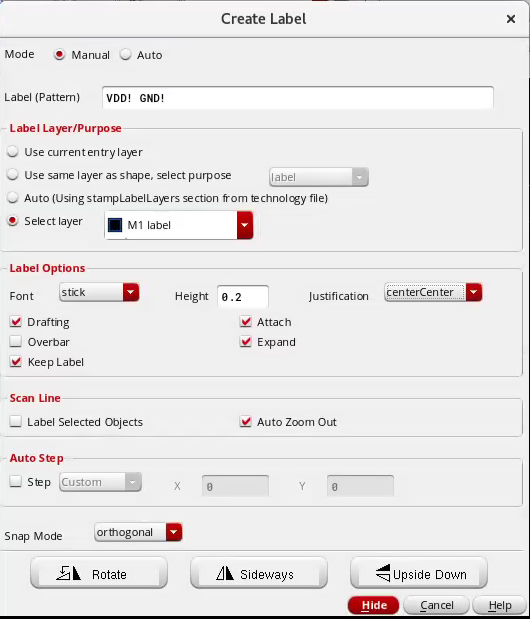 VDD!orGND!in Label(pattern), Select Layeris M1 label,Label Heightis 0.2.