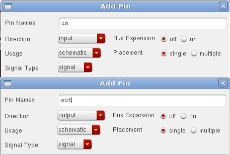 Pins define where the wires outside the cell can be connected to the cell. In our example, we need pins for IN, OUT, VDD! and GND!. And VDD! an GND are connectted with M1, which goes horizontally between cells, IN and OUT are connectted with M2, which goes veritically between cells.