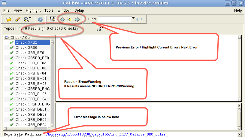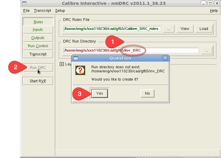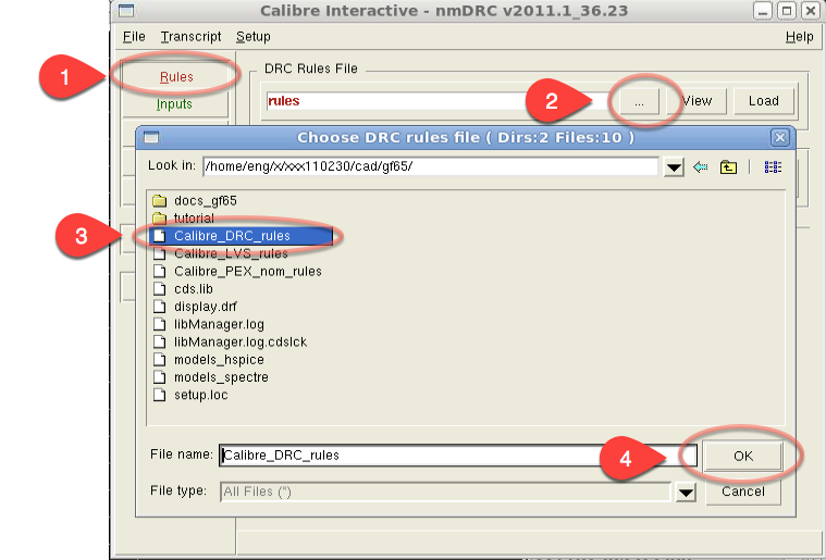 Click Rules tab first, DRC Rules File is located in the gf65 folder in your home directory, named Calibre_DRC_rules