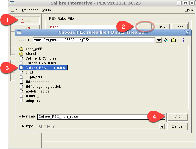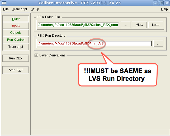 Click Rules tab first, PEX Rules File is located in the gf65 folder in your home directory, named Calibre_PEX_nom_rules