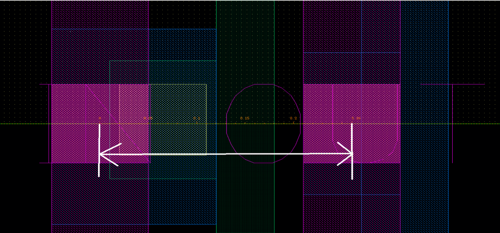 9.Click on PC drawing layer and create a rectangle crosses the middle two RX rectangles as shown.