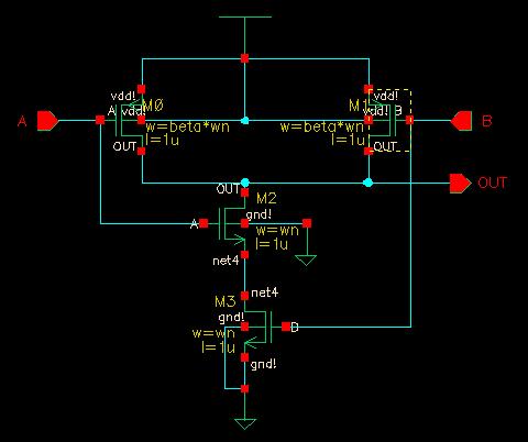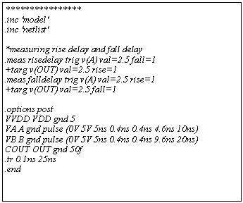 From the simulation results, we have the correct functionality of the NAND2 gate. Now, you should be able to do your transient analysis. You might note that there are two .meas statements in the HSpice file, these two are for measuring the 50%-50% rise delay and fall delay. After running the simulation, you can look for these measurements in the *.mt0 file. If you want to have a symmetrical NAND2 gate or optimize the performance, you can use the sweep function provided by HSpice. Since parameters are specified in the netlist file, you can just add the following statements in your simulation code.