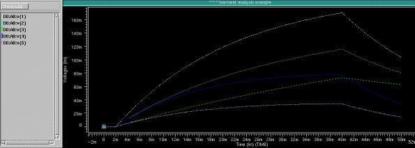 The following example performs and prints the transient analysis every 1ns to 100ns.