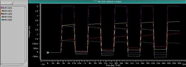 The .TRAN statement UIC parameter in the above example bypasses the initial DC operating point analysis. The .OP statement calculated transient operating points at time=0 and time=20ns during the transient analysis.