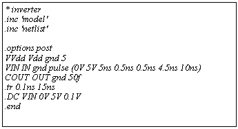 By using your favorite text editor to create the above file in *.sp, you are ready to run Hspice simulation.