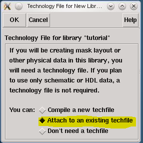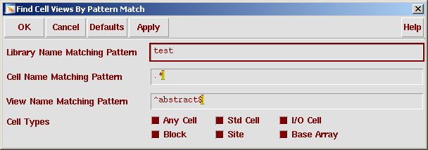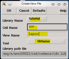 Enter the library name of your cell library, the cell name of your design (the name of your top level module is a good idea), and Layout for View Name.