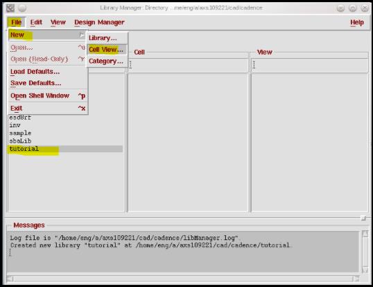 Next make sure tutorial is highlighted in the Library Manager window, it means click tutorial first then click on File -> New -> Cell View..