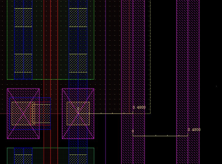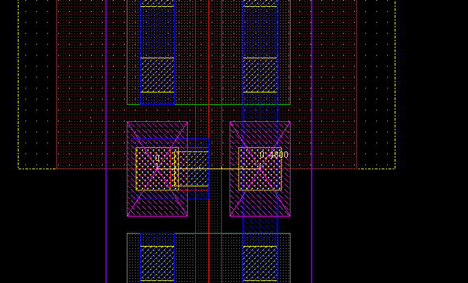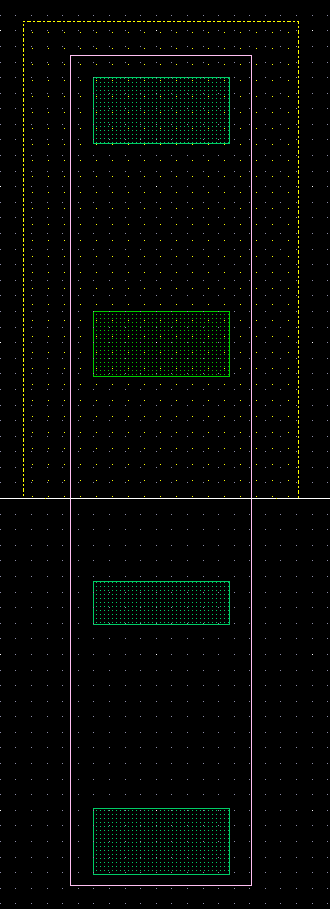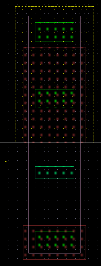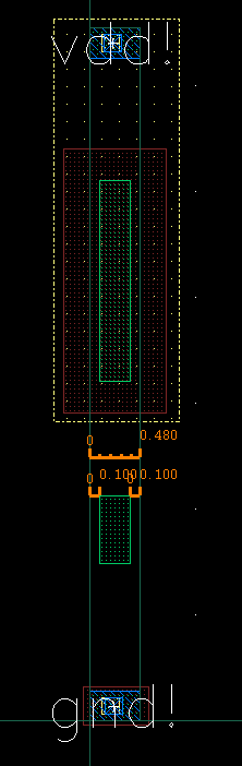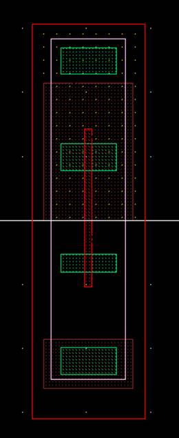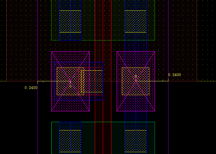 Click on RX drw (diffusion) and create four rectangles as shown. Two of the rectangles will reside in the NW, and the other two will be outside the NW.