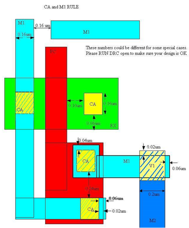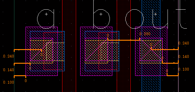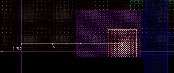 Click on CA drw (contact) and place rectangles of the size 0.16u x 0.16u in the places shown below.