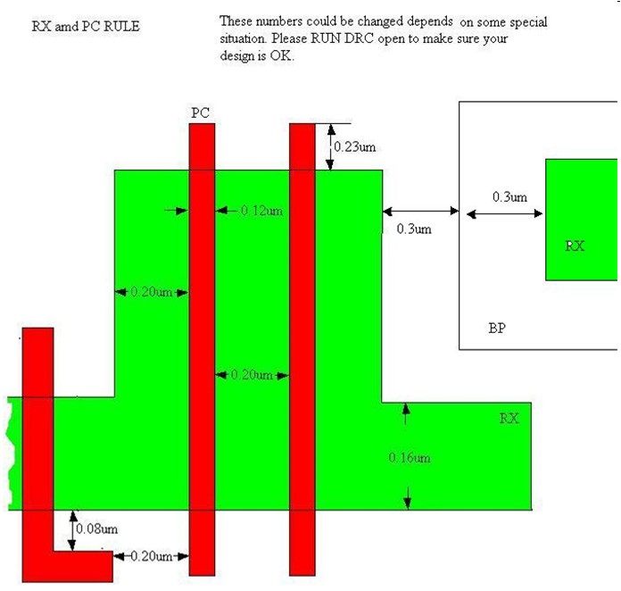 Click on PC drw (poly) and create a bar that crosses the middle two RX rectangles as shown.