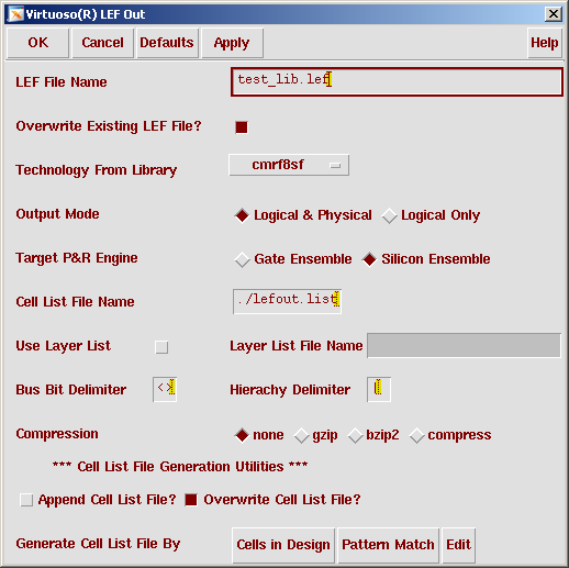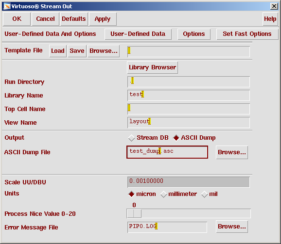 Enter your library name and library cell name in the resulting window. Make sure the view name is layout, and select ASCII Dump and enter an output filename (with extension ".asc"). Make sure Units is set to micron and click OK to generate an ASCII physical description file.
