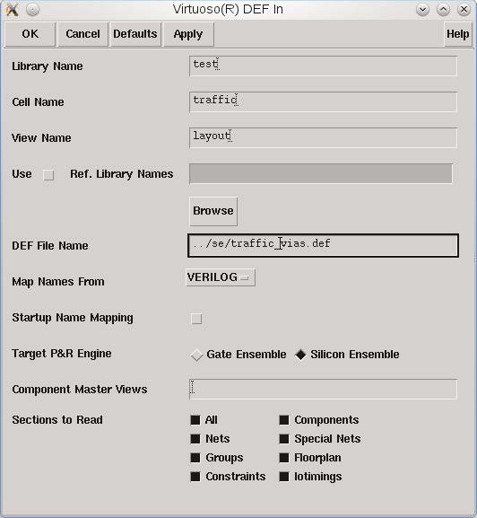 Enter the location and name of the .def file, make sure that Target P&R Engine is set to Silicon Ensemble and Sections to Read is set to All. Click OK.