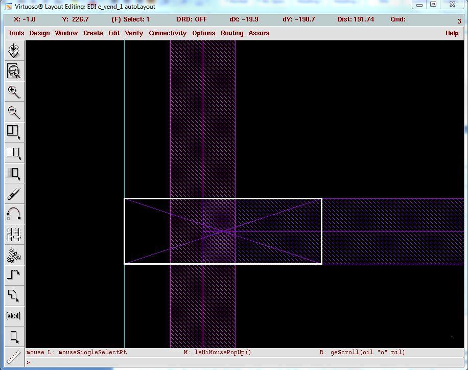 - If you want to draw rectangles of another layer, click left mouse button to select your layer in LSW to change the drawing layer then click left mouse button for the two corners in Virtuoso Layout Editing window.