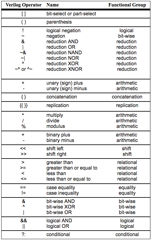 Logical bit-wise operators take two single or multiple operands on either side of the operator and return a single bit result. The only exception is the NOT operator, which negates the single operand that follows. Verilog does not have the equivalent of NAND or NOR operator, their funstion is implemented by negating the AND and OR operators.